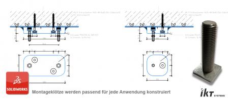 Ein Montageklotz wird im Standard mittels Klebe- oder Schraubanker oder gleichwertig durch die Auskleidung hindurch im Untergrund befestigt. Hierbei ragen die Ankerstangen inkl. Unterlegscheibe und Mutter in den Montageklotz hinein. Im Nachgang wird der übrige Hohlraum des Bohrloches mittels Schweißzusatz gefüllt und überschweißt. Die Befestigung der Anbauten erfolgt an in den Montageklotz eingelassenen Stehbolzen M12/16 mit Rückseitig verschweißter Verdrehsicherung (40 x 40 mm) aus Edelstahl A4 1.4571 oder gleichwertig (siehe Bild 6‑3).